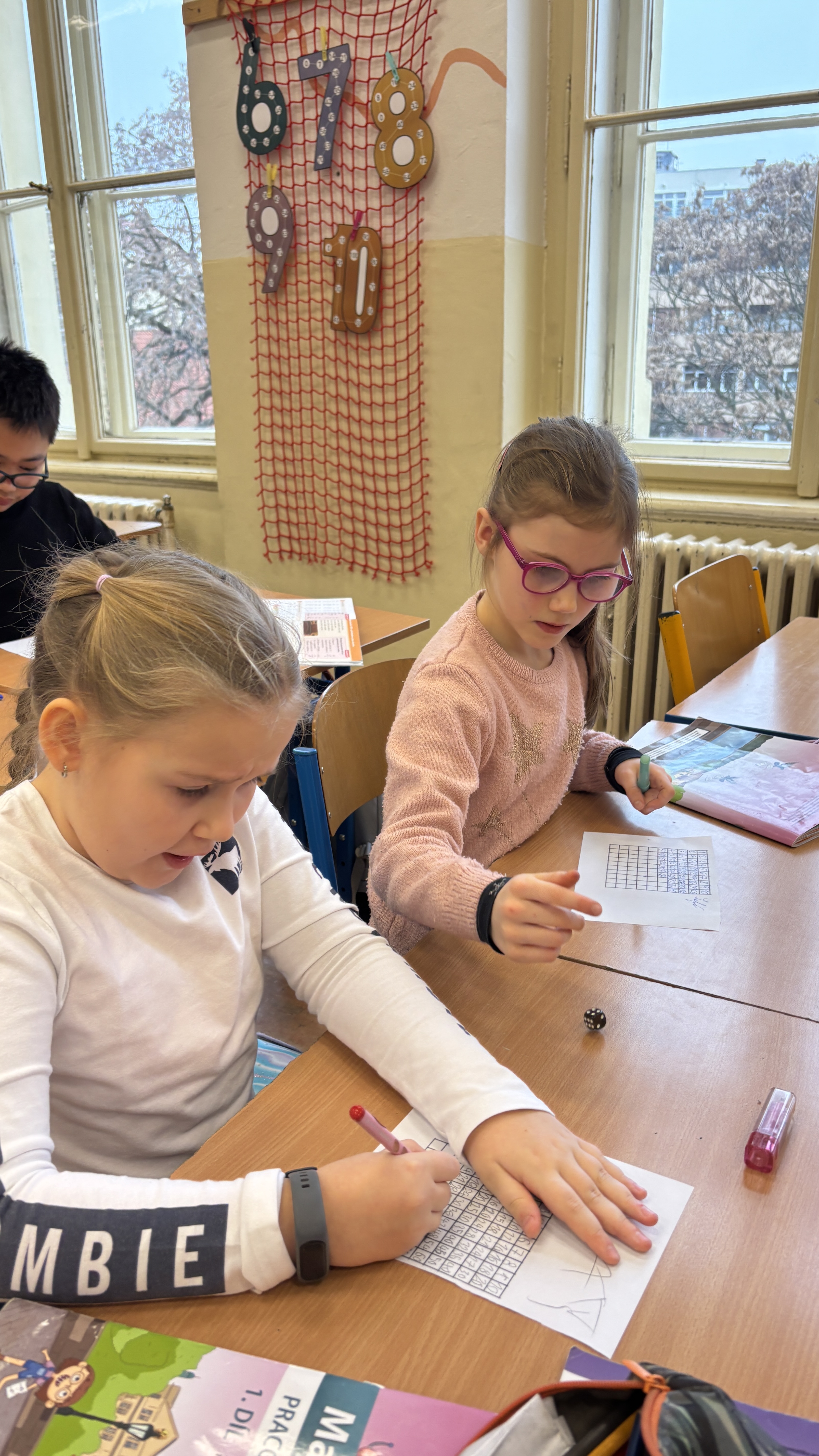 V matematice se učíme násobilku. Zatím násobíme a dělíme do 7. Zlepšili jsme se ve slovních úlohách a nezapomínáme ani sčítat a odčítat do 100, abychom to při tom všem nezapomněli. Na okamžik si děti také vyzkoušely být v rolích beebotů a navigovali je spolužáci po čtvercové síti.