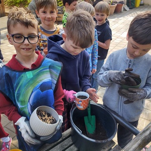 Staráme se o školní zahradu, máme tu dva velké květináče s jarními květinami a budujeme vyvýšený záhonek.